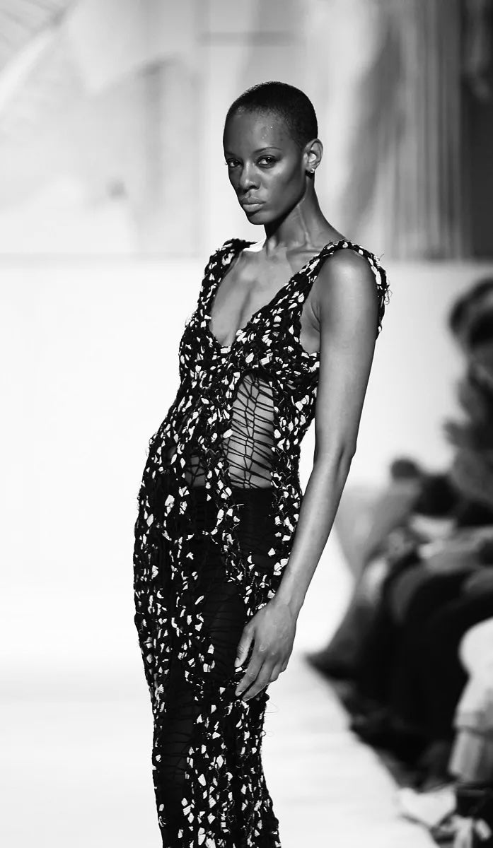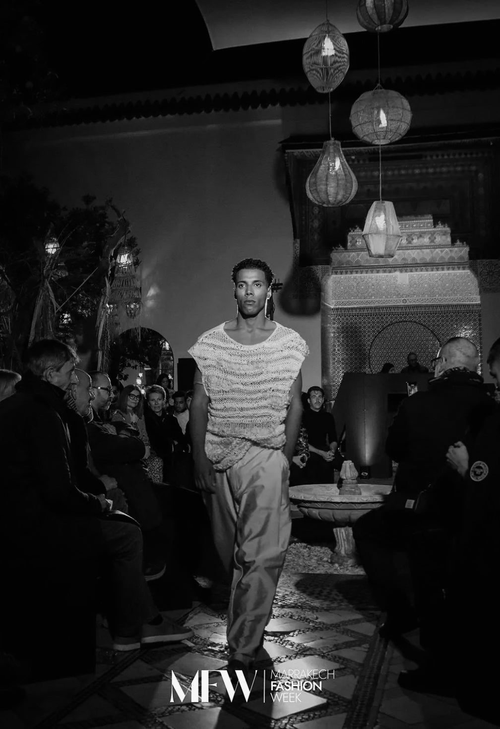 Giovanni Cavagna presented a collection that fully expresses his philosophy. The garments seem to arise from a process of deconstruction, in which each element is broken down and then recomposed with mastery, giving life to new shapes and volumes. This approach not only enhances the designer's creativity, but also offers a new perspective on contemporary fashion, challenging conventions and proposing a new dialogue between tradition and innovation. Cavagna's collection stands out for the skilful use of materials and attention to details. Fine fabrics are transformed through bold cuts and apparent stitching, creating visual and tactile contrasts that capture the eye. Despite the complexity of the techniques used, each garment maintains an elegant simplicity that makes the collection accessible and refined. The volumes play a fundamental role in the collection presented in Marrakech. Asymmetric lines and fluid silhouettes combine to create garments that move with the body, offering a sense of freedom and lightness. This technique perfectly combines avant-garde fashion with one deeply rooted in a minimalist aesthetic.